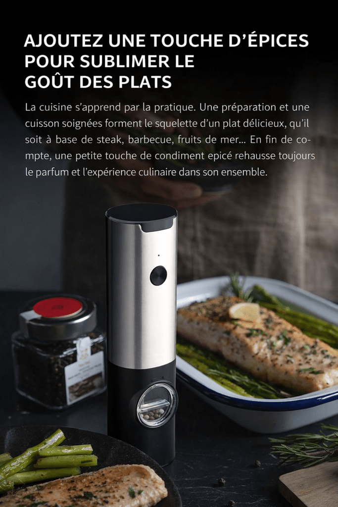 Fabriqué en acier inoxydable robuste et ABS de haute qualité, ce moulin combine design élégant, durabilité et performance. Son réservoir transparent vous permet de vérifier facilement la quantité restante d’épices, tandis que sa lumière LED intégrée éclaire vos plats pendant l’utilisation pour un dosage parfait.